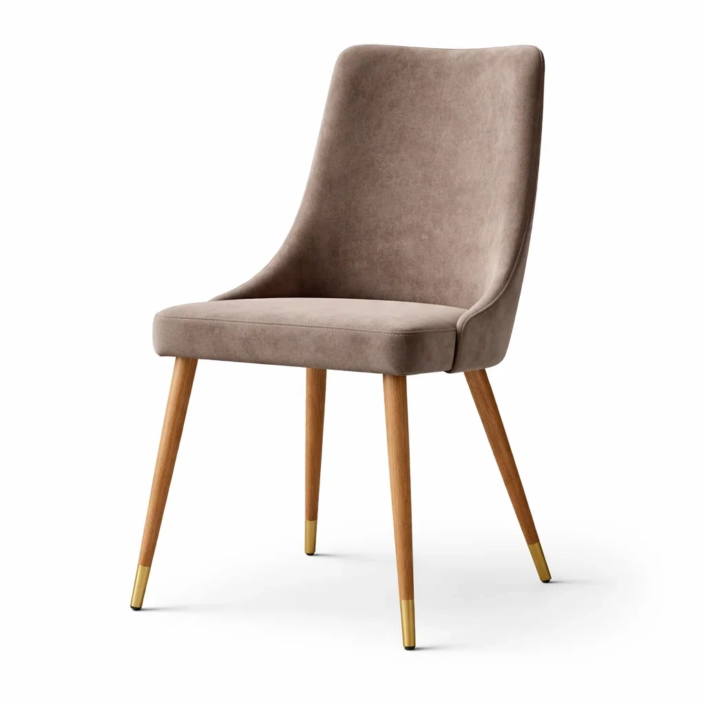 Chaise de salle à manger en velours marron avec pieds en bois et ornements en laiton
