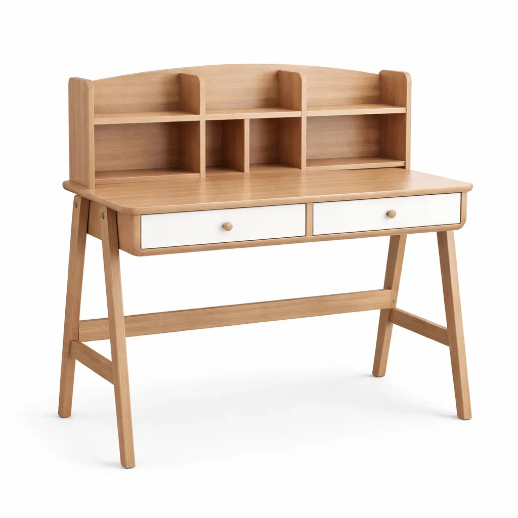 Fonctionnalités: Bureau avec surface de travail, étagères de rangement et tiroirs.