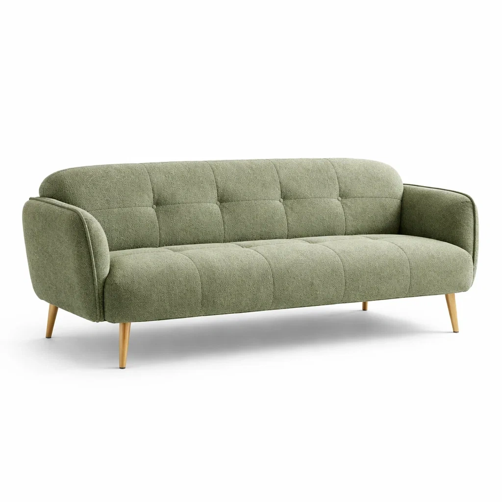 Ce canapé trois places est recouvert de tissu en polyester vert et repose sur des pieds en bois. La structure est en bois massif, assurant une solidité et une stabilité accrues. Les coussins d'assise et de dossier sont rembourrés de mousse haute densité pour un confort optimal.